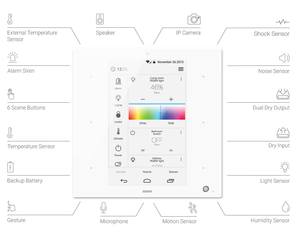 A horvát Zipato cég Zipatile elnevezésű terméke ránézésre egy falra szerelhető tabletre hasonlít. Tudván, hogy Z-Wave alapú okosotthon berendezéseket gyártanak, így egy látványos kezelőfelületű távvezérlőre gondolhat az, aki látja, de a Zipatile jóval több ennél. Igaz, egy 800×1280 képpont felbontású érintőképernyőt kínál, amin keresztül a lakás minden távvezérelhető funkciója kényelmesen felügyelhető, akár csak egy tabletről, viszont a vékony készülék maga a vezérlőközpont is! Ráadásul számtalan szenzort is tartalmaz, mint pl. mikrofont, fényerősség-, páratartalom-, hőmérsékletmérőt, mozgás- és vibrációérzékelőt, de kamera és hangszóró/sziréna is került bele. Hálózatunkhoz wifin és etherneten(külön adapter szükséges) is képes csatlakozni, valamint Zigbee eszközöket is támogat.